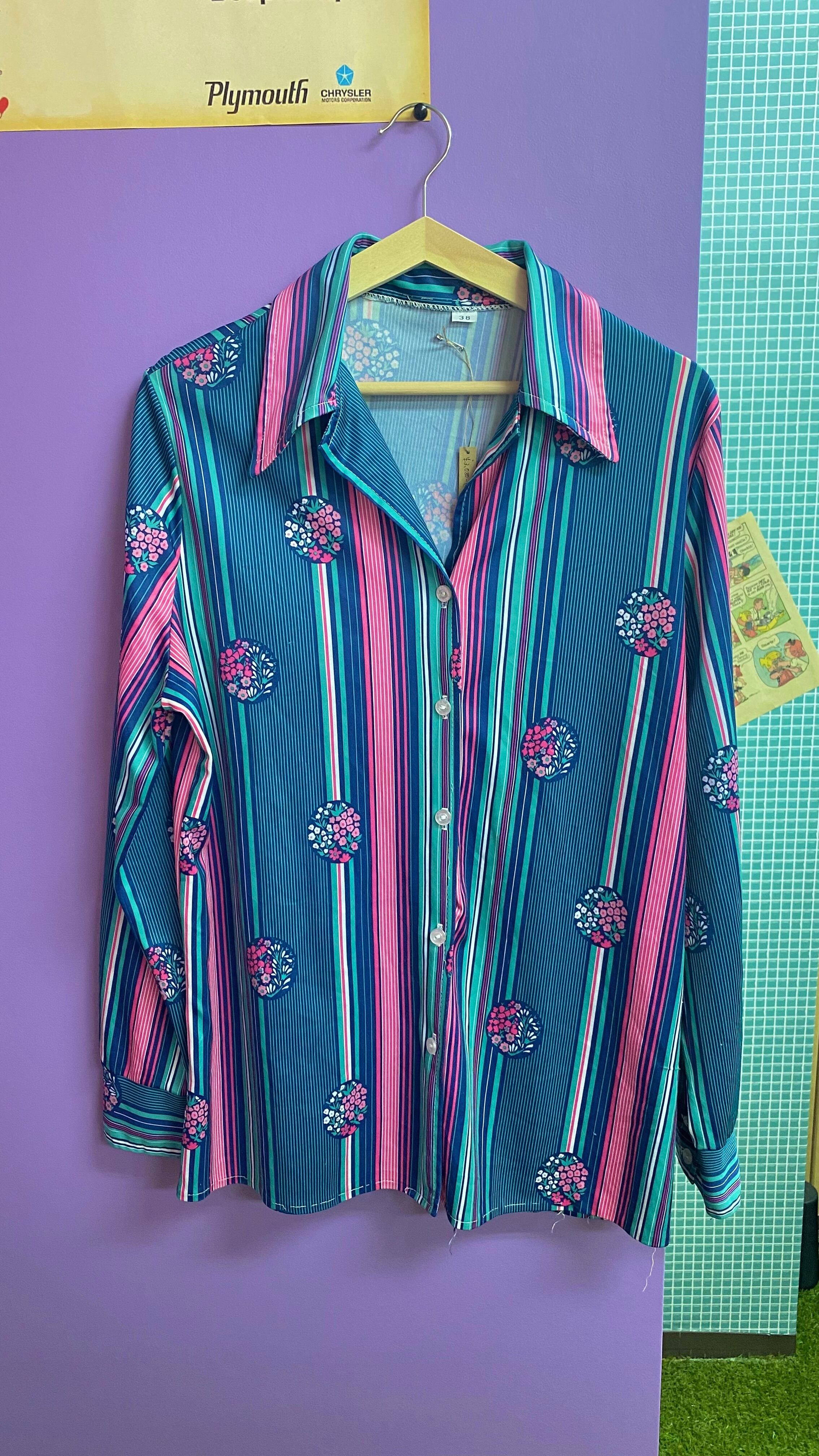 ストライプシャツ グリーン×ピンク
